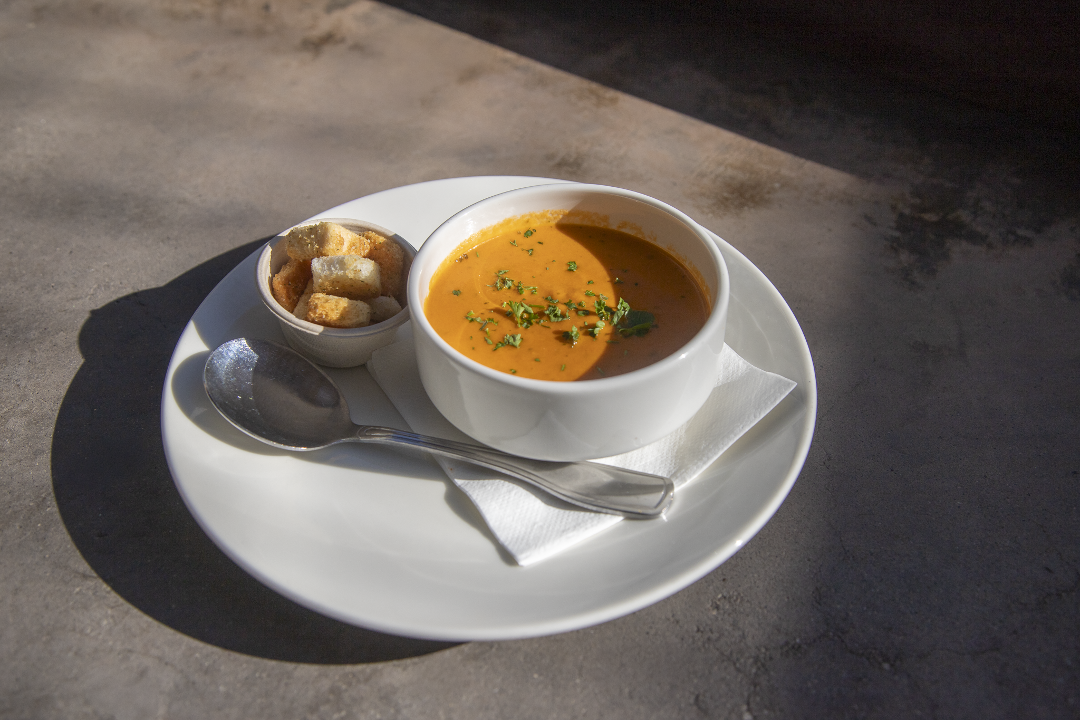 A cup, served with herbed croutons.