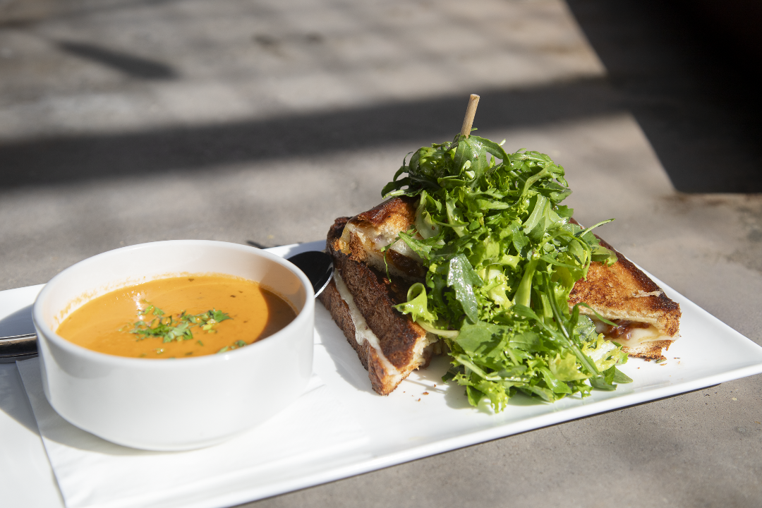 Gruyere, havarti, Tillamook aged cheddar, gorgonzola, bacon-onion jam, griddled brioche, peppery greens, roasted tomato-basil bisque.