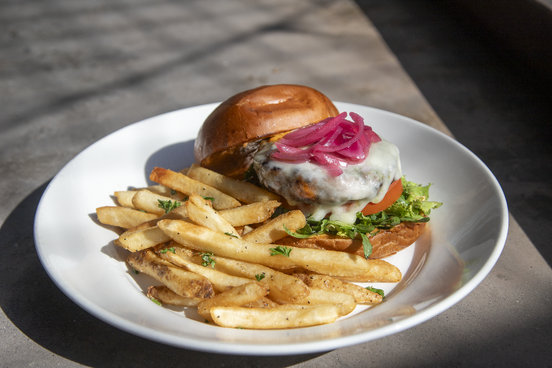 House-made turkey patty topped with chili-citrus sauce, cotija, avocado, lettuce, tomato, chili aioli served with fries.