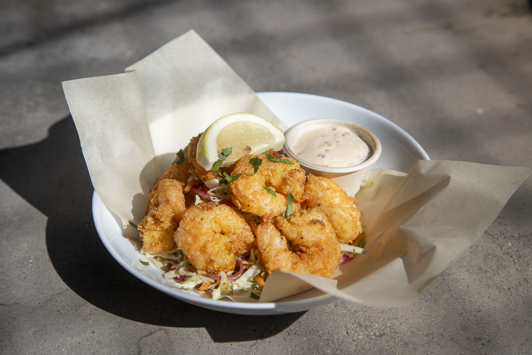 Cornmeal-crusted shrimp, hot sauce aioli, pickled onion slaw, cilantro, lemon.
