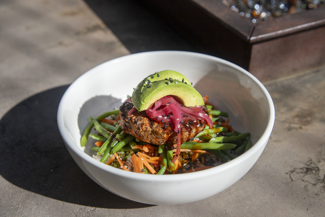 Avocado, pickled onions, quinoa rice, sautéed green beans, carrots, Korean BBQ sauce, cilantro oil, sesame seeds and grilled salmon.