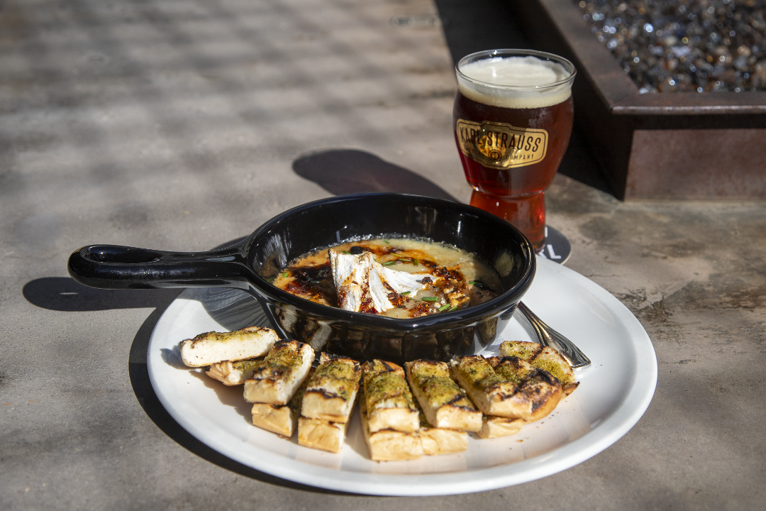 Oven-warmed brie & gorgonzola with beer onions, black garlic, roasted red peppers, sesame chili crisp, grilled bread.
