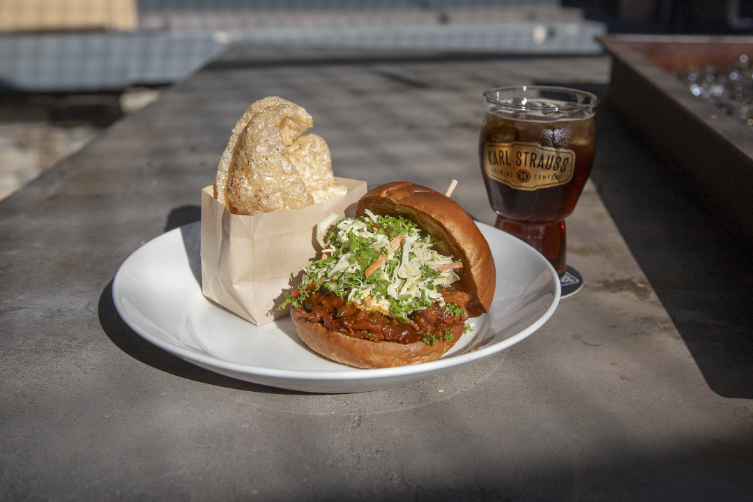 Smoked pulled pork, spicy habanero-cherry cola bbq sauce, red onion, pasilla, curry kale slaw, side of seasoned chicharrón chips.